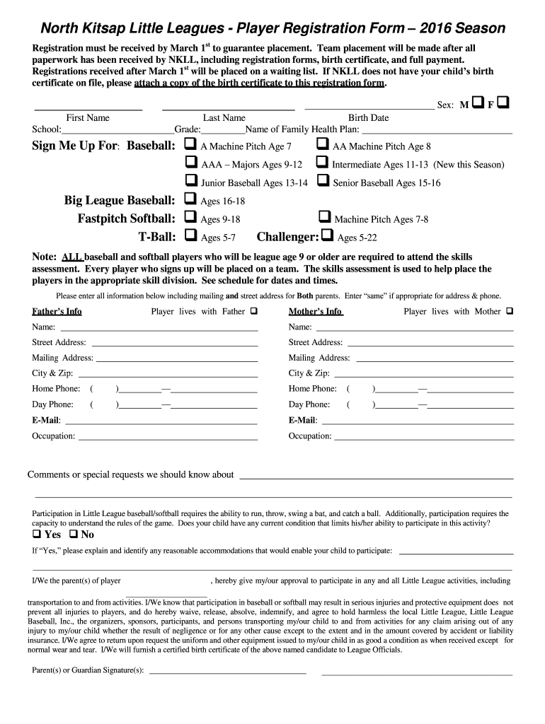 North Kit sap Little Leagues Player Registration Form 2016 Season Registration must be received by March 1st to guarantee placement. Team placement will be made after all paperwork has been received