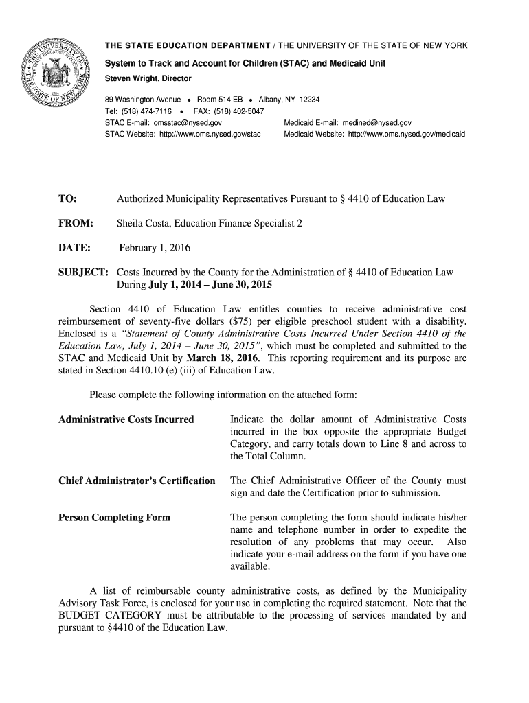 Get the free 2014-15 County Administrative Cost Letter - New York State ... - oms nysed