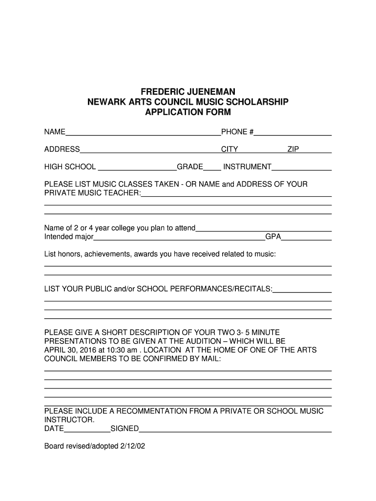 FREDERIC FREEMAN NEWARK ARTS COUNCIL MUSIC SCHOLARSHIP APPLICATION FORM NAME PHONE # ADDRESS CITY HIGH SCHOOL GRADE ZIP INSTRUMENT PLEASE LIST MUSIC CLASSES TAKEN OR NAME and ADDRESS OF YOUR PRIVATE