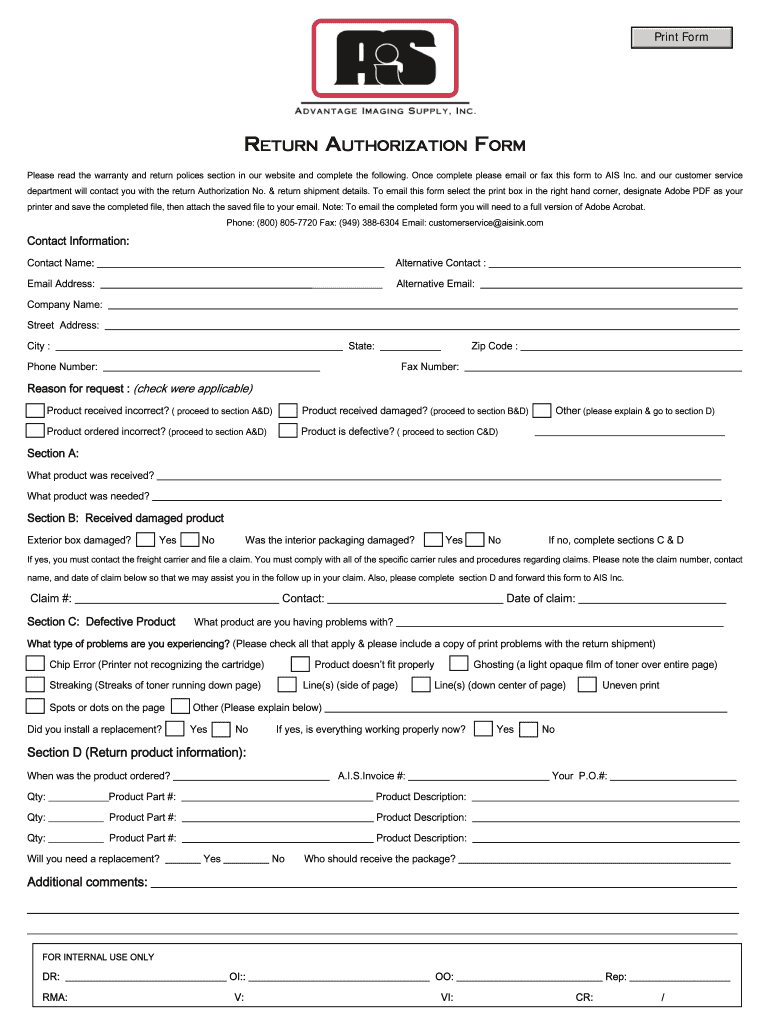 Get the free Return Authorization Form - Aisink