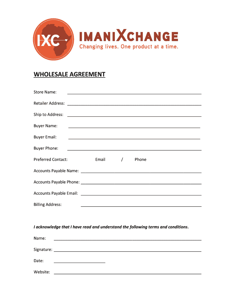 Fill in the names and contact information of both the wholesaler (Imani) and the retailer/ buyer. Include the legal name, address, phone number, and email address for accurate identification.