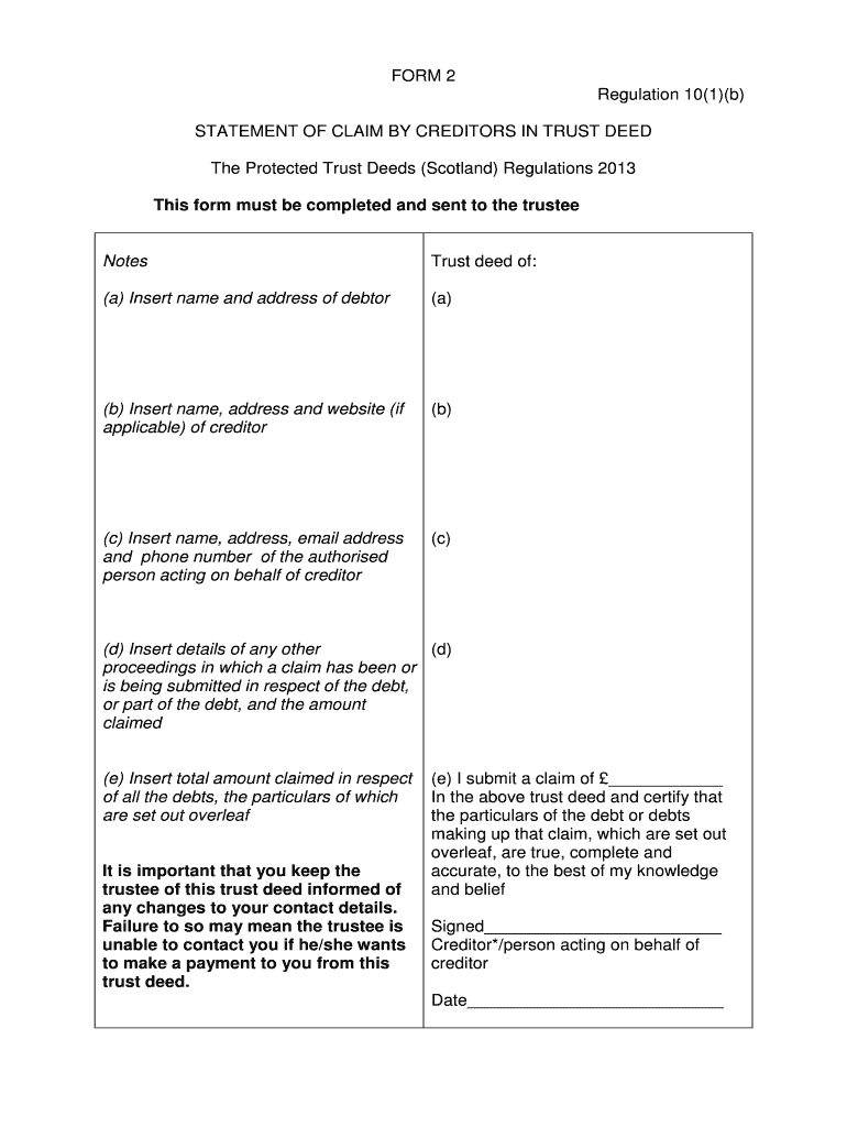 FORM 2 Regulation 10(1)(b) STATEMENT OF CLAIM BY CREDITORS IN TRUST DEED The Protected Trust Deeds (Scotland) Regulations 2013 This form must be completed and sent to the trustee Notes Trust deed