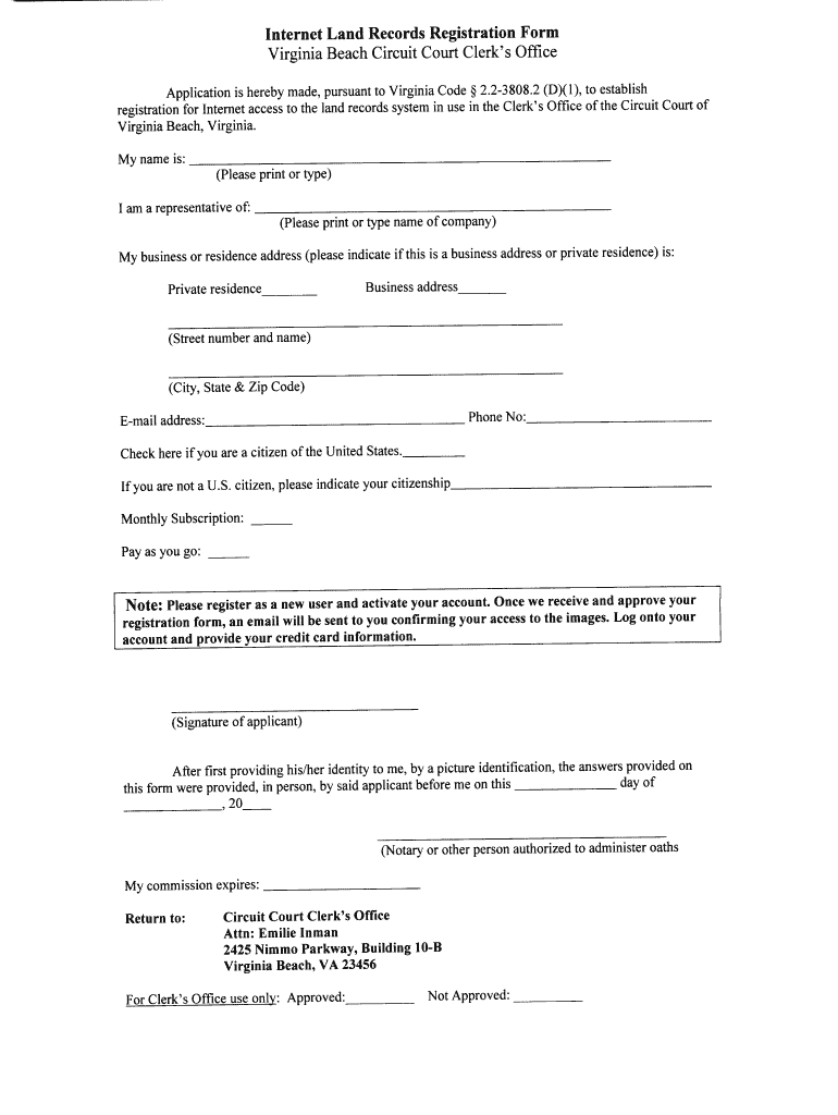 Internet Land Records Registration Form Virginia Beach Circuit Court Clerk's Office Application is hereby made, pursuant to Virginia Code 2.23808.2 (D)(1), to establish registration for Internet access