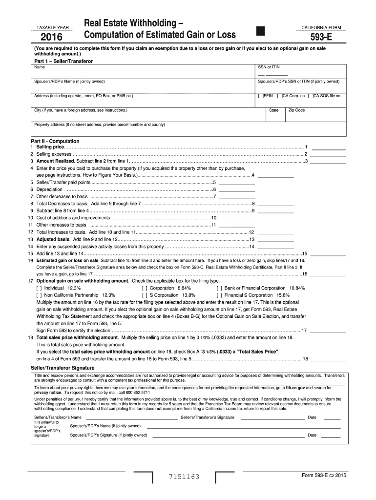 Real Estate Withholding Computation of Estimated Gain or Loss June 13, 2016, TAXABLE YEAR 2016 CALIFORNIA FORM 593E (You are required to complete this form if you claim an exemption due to a loss