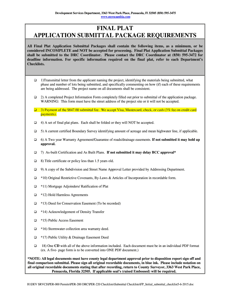 Get the free Subdivision-Final Plat Checklist Package - Escambia County