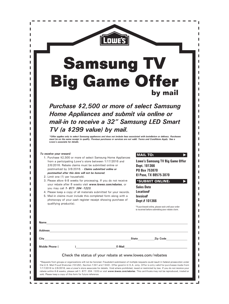 Samsung TV Big Game Offer by mail Purchase $2,500 or more of select Samsung Home Appliances and submit via online or mailing to receive a 32 Samsung LED Smart TV (a ×299 value) by mail. *Offer applies