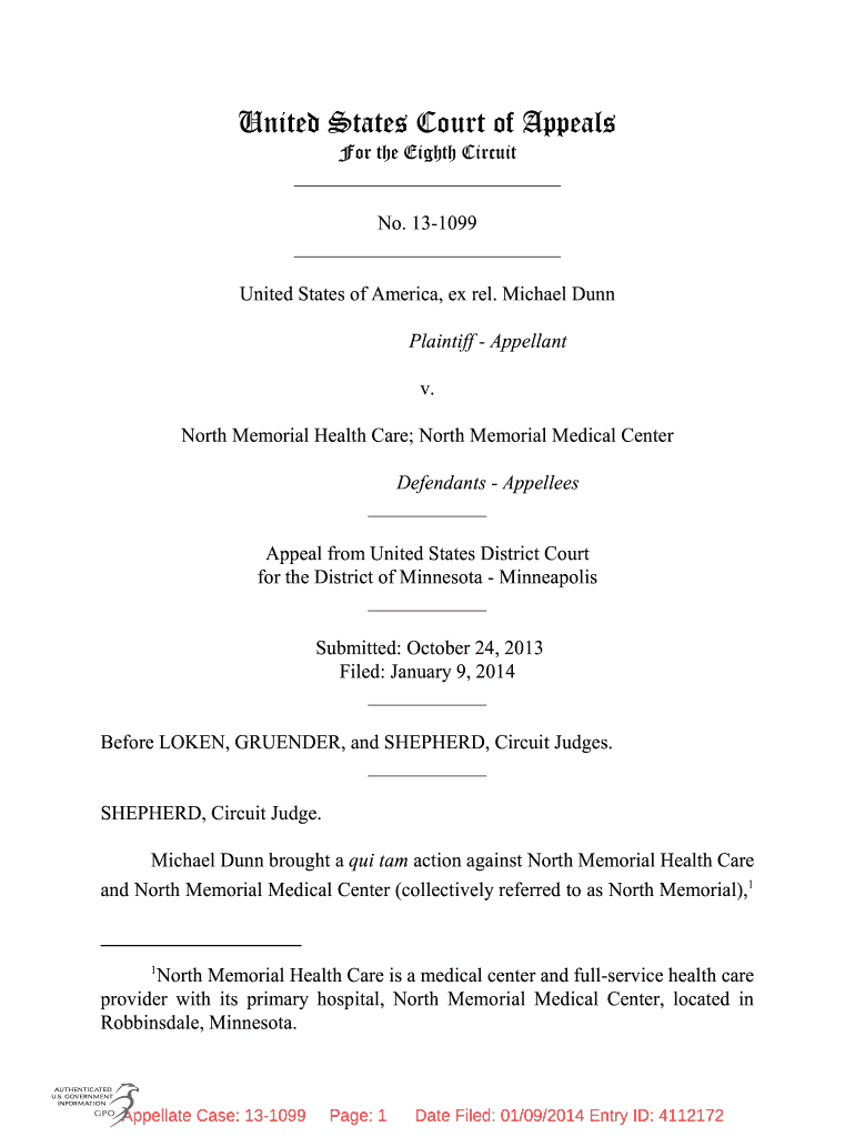 United States Court of Appeals For the Eighth Circuit No. 131099 United States of America, ex rel. Michael Dunn lllllllllllllllllllll Plaintiff Appellant v. North Memorial Health Care; North Memorial