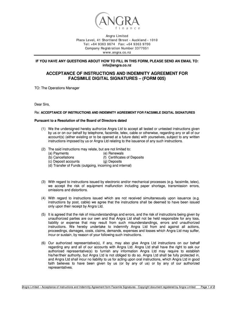 Get the free acceptance of instructions and indemnity agreement ... - Angra Limited - angra co