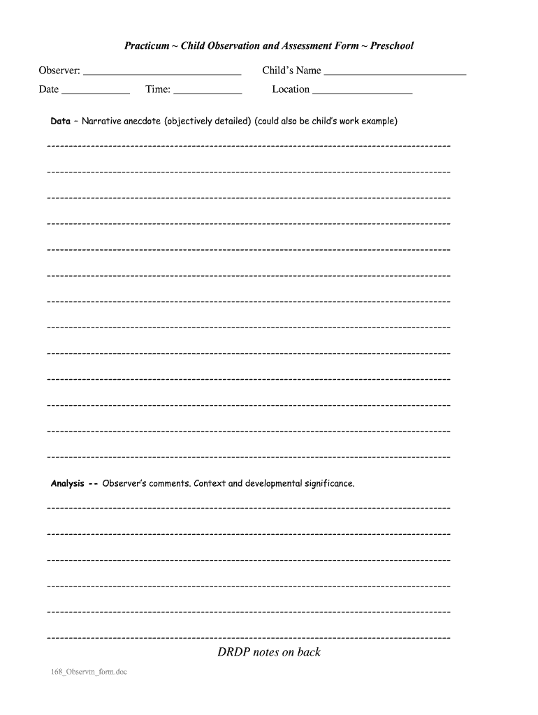 Practicum Child Observation and Assessment Form Preschool Observer: Date Time: Child's Name Location Data Narrative anecdote (objectively detailed) (could also be children work example)