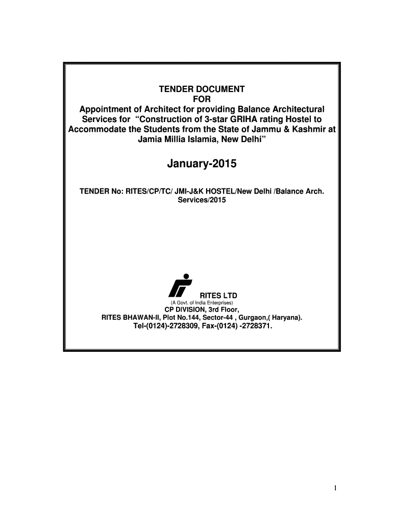 TENDER DOCUMENT FOR Appointment of Architect for providing Balance Architectural Services for Construction of 3star GRI HA rating Hostel to Accommodate the Students from the State of Jammy & Kashmir
