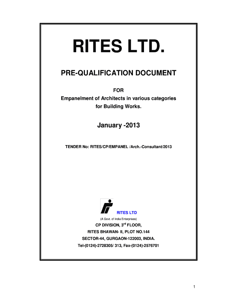 RITES LTD. PREQUALIFICATION DOCUMENT FOR Embankment of Architects in various categories for Building Works. January 2013 TENDER No: RITES/CP/EMPANEL /Arch.Consultant/2013 RITES LTD (A Govt. of India