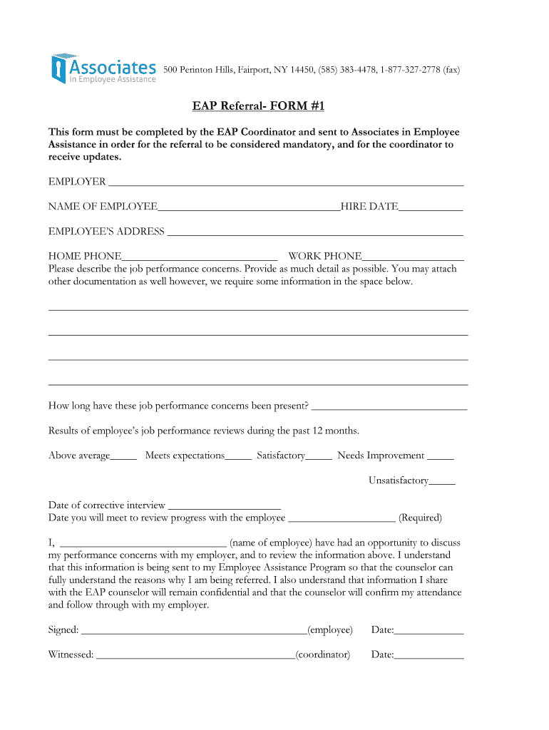 500 Period Hills, Airport, NY 14450, (585) 3834478, 18773272778 (fax) EAP Referral FORM #1 This form must be completed by the EAP Coordinator and sent to Associates in Employee Assistance in order