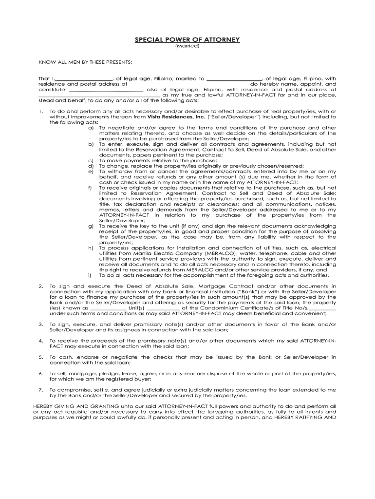 SPECIAL POWER OF ATTORNEY (Married) KNOW ALL MEN BY THESE PRESENTS: That I, of legal age, Filipino, married to, of legal age, Filipino, with residence and postal address at do hereby name, appoint,