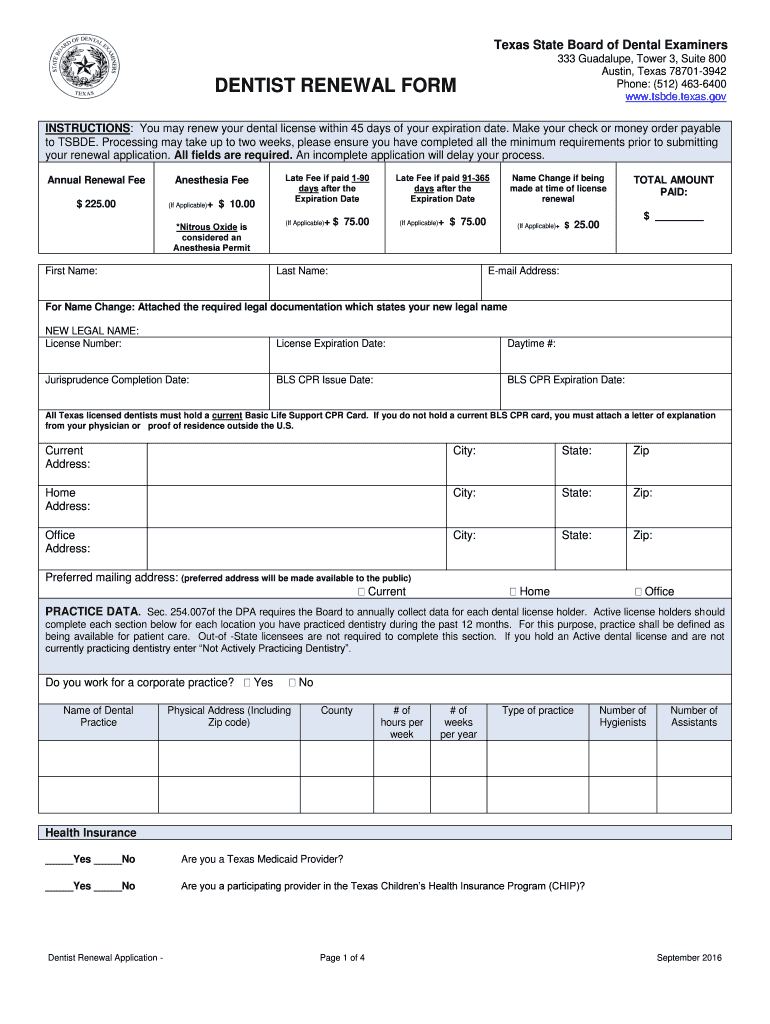 Get the free Austin, Texas 78701-3942 DENTIST RENEWAL FORM... - tsbde texas