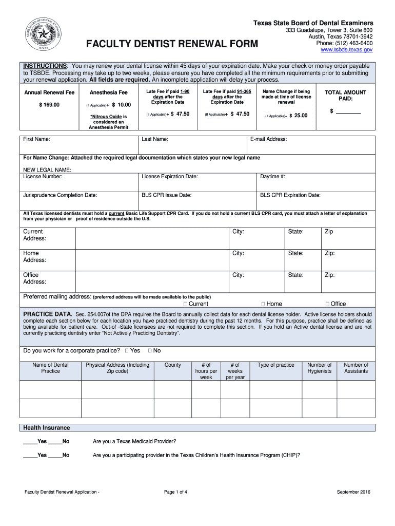 Get the free Austin, Texas 78701-3942 FACULTY DENTIST RENEWAL... - tsbde texas
