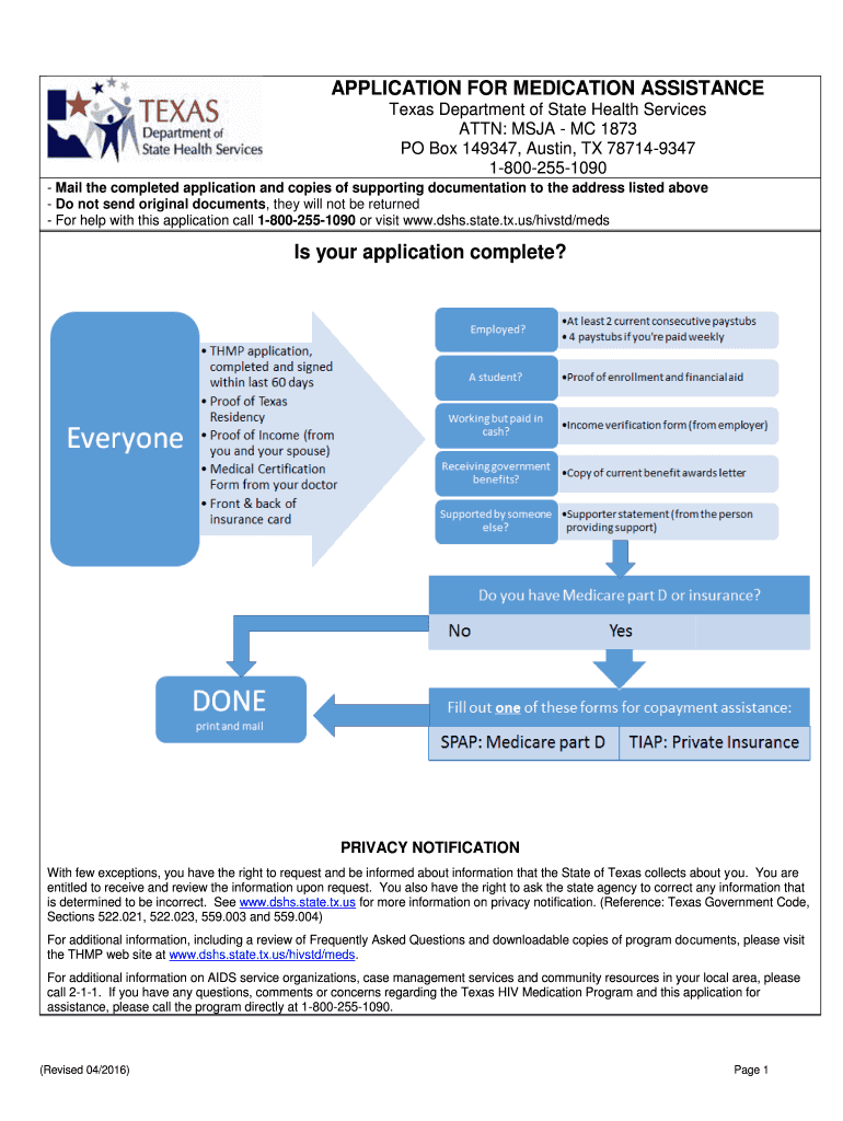 APPLICATION FOR MEDICATION ASSISTANCE Texas Department of State Health Services ATTN: MSA MC 1873 PO Box 149347, Austin, TX 787149347 18002551090 Mail the completed application and copies of supporting