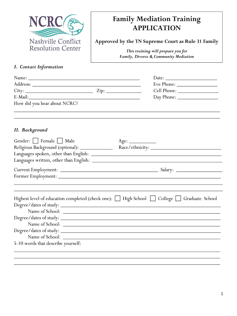 Family Mediation Training APPLICATION Approved by the TN Supreme Court as Rule 31 Family This training will prepare you for Family, Divorce & Community Mediation I. Contact Information Name: Date:
