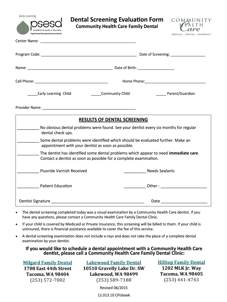 Get the free Dental Screening Evaluation Form - earlylearningwa