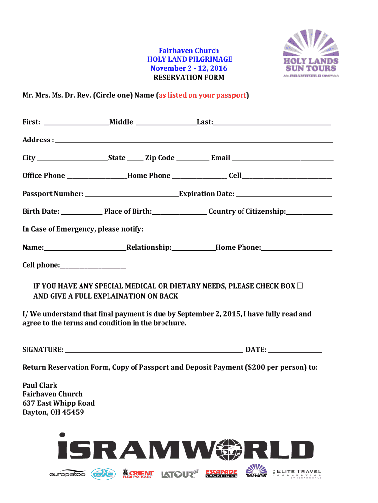Fair haven Church HOLY LAND PILGRIMAGE November 2 12, 2016 RESERVATION FORM Mr. Mrs. Ms. Dr. Rev. (Circle one) Name (as listed on your passport) First: Middle Last: Address : City State Zip Code Email
