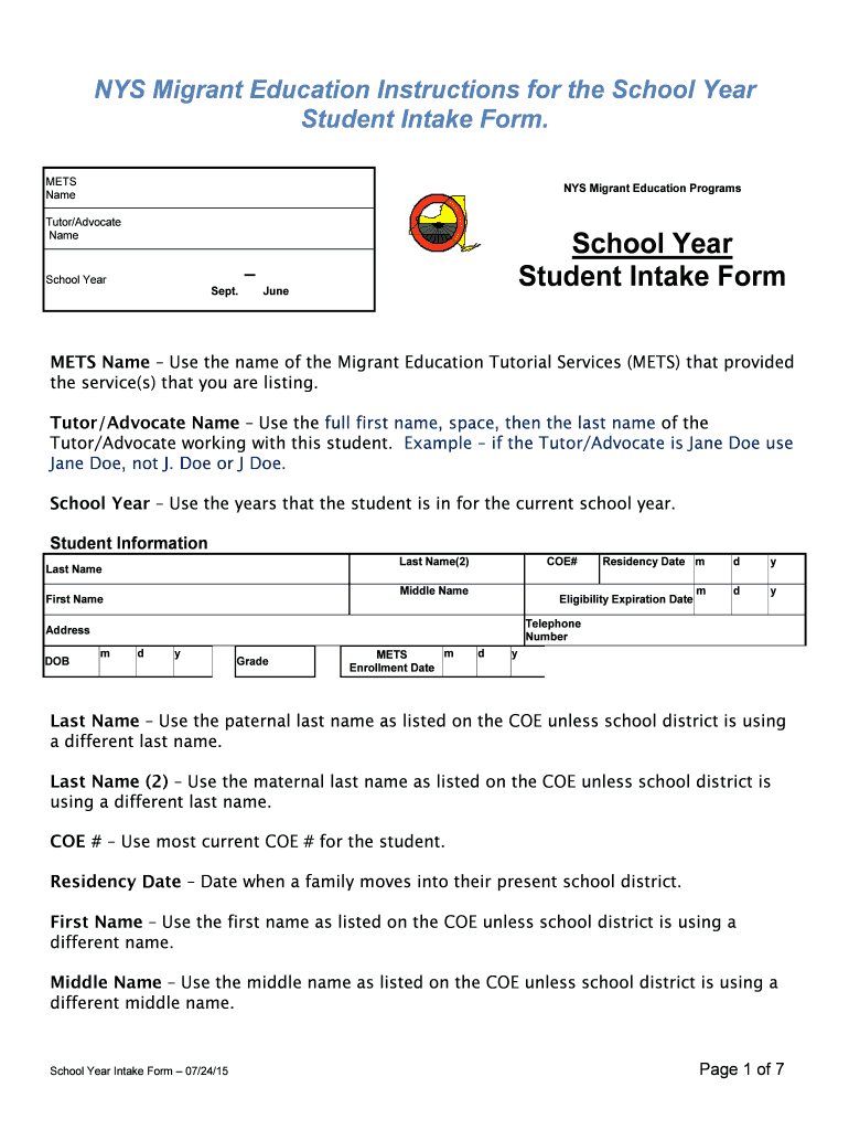 NYS Migrant Education Instructions for the School Year Student Intake Form. METS Name NYS Migrant Education Programs Tutor/Advocate Name School Year Student Intake Form School Year Sept. June Use