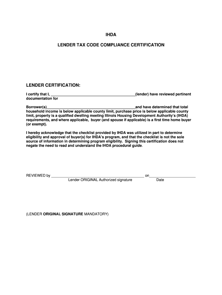 Get the free IHDA LENDER TAX CODE COMPLIANCE CERTIFICATION - ihda