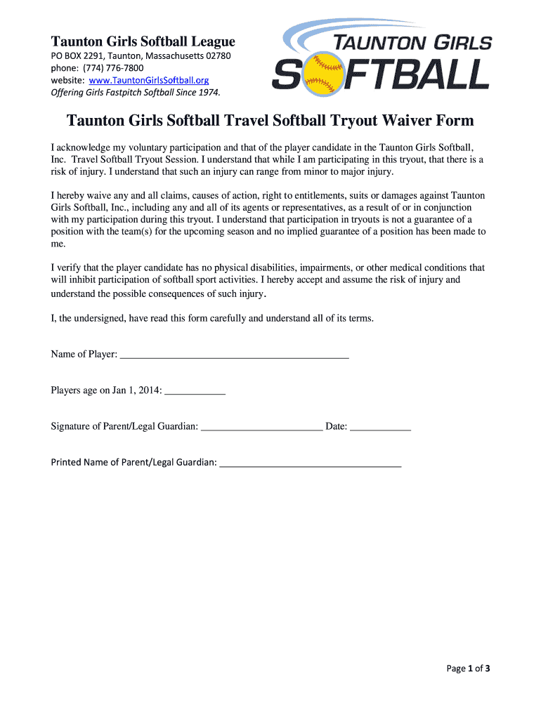 Get the free Taunton Girls Softball Travel Softball Tryout Waiver Form