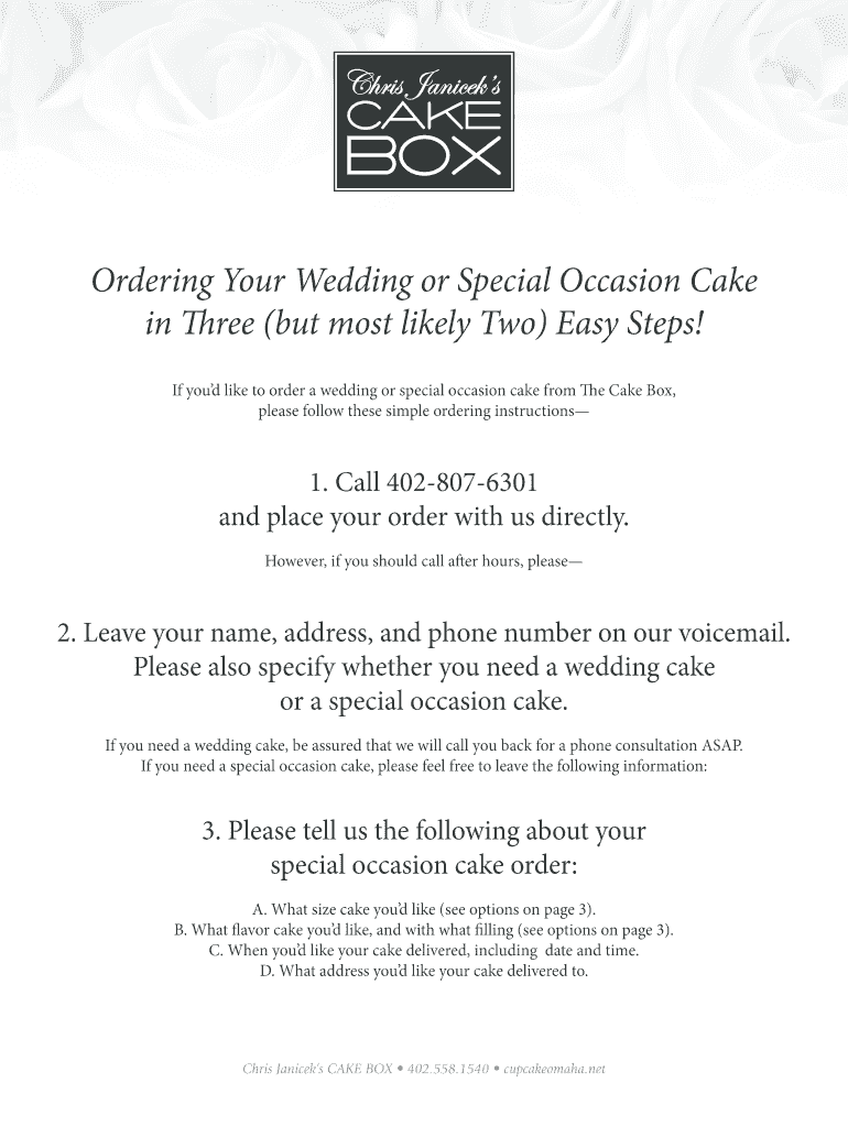 Ordering Your Wedding or Special Occasion Cake in Three (but most likely Two) Easy Steps! If you'd like to order a wedding or special occasion cake from The Cake Box, please follow these simple orderinginstructions1.