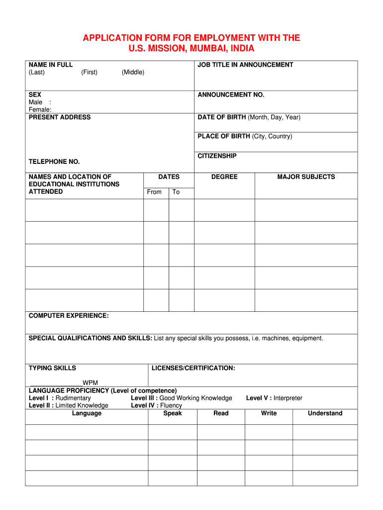 APPLICATION FORM FOR EMPLOYMENT WITH THE U.S. MISSION, MUMBAI, INDIA NAME IN FULL (Last) JOB TITLE IN ANNOUNCEMENT (First) (Middle) SEX Male : Female: PRESENT ADDRESS ANNOUNCEMENT NO. DATE OF BIRTH