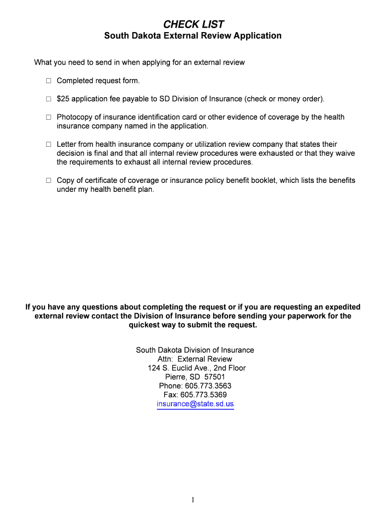 CHECK LIST South Dakota External Review Application What you need to send in when applying for an external review Completed request form. $25 application fee payable to SD Division of Insurance (check