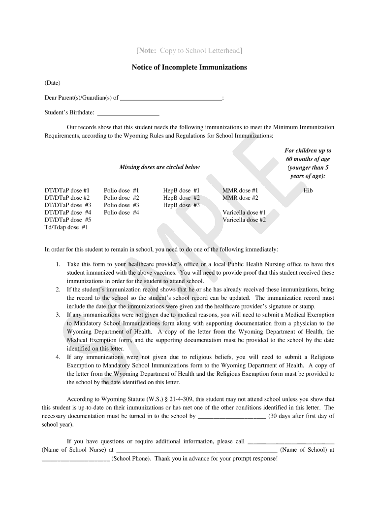 Note: Copy to School Letterhead Notice of Incomplete Immunizations (Date) Dear Parent(s)/Guardian(s) of : Students Birthdate: Our records show that this student needs the following immunizations to