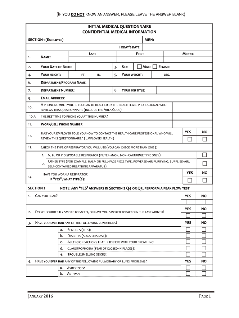 Employees who are required to wear a respirator as part of their job duties are typically required to file a respiratory fit test questionnaire.