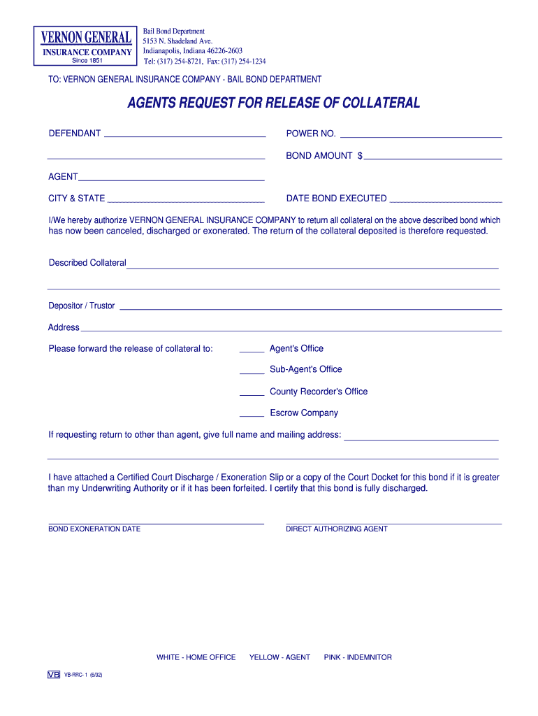Bail Bond Department 5153 N. Shad eland Ave. TO: VERNON GENERAL INSURANCE COMPANY — BAIL BOND DEPARTMENT AGENTS REQUEST FOR RELEASE OF