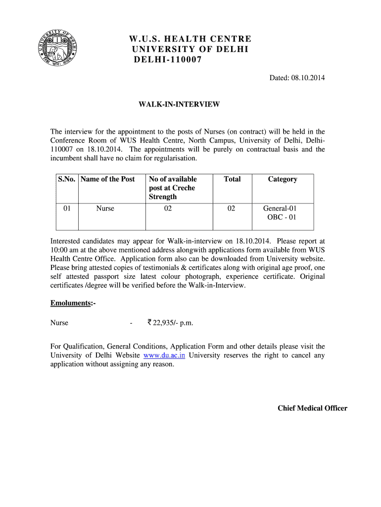 W.U.S. HEALTH Center UNIVERSITY OF DELHI DELHI110007 Dated: 08.10.2014 WALKININTERVIEW The interview for the appointment to the posts of Nurses (on contract) will be held in the Conference Room of