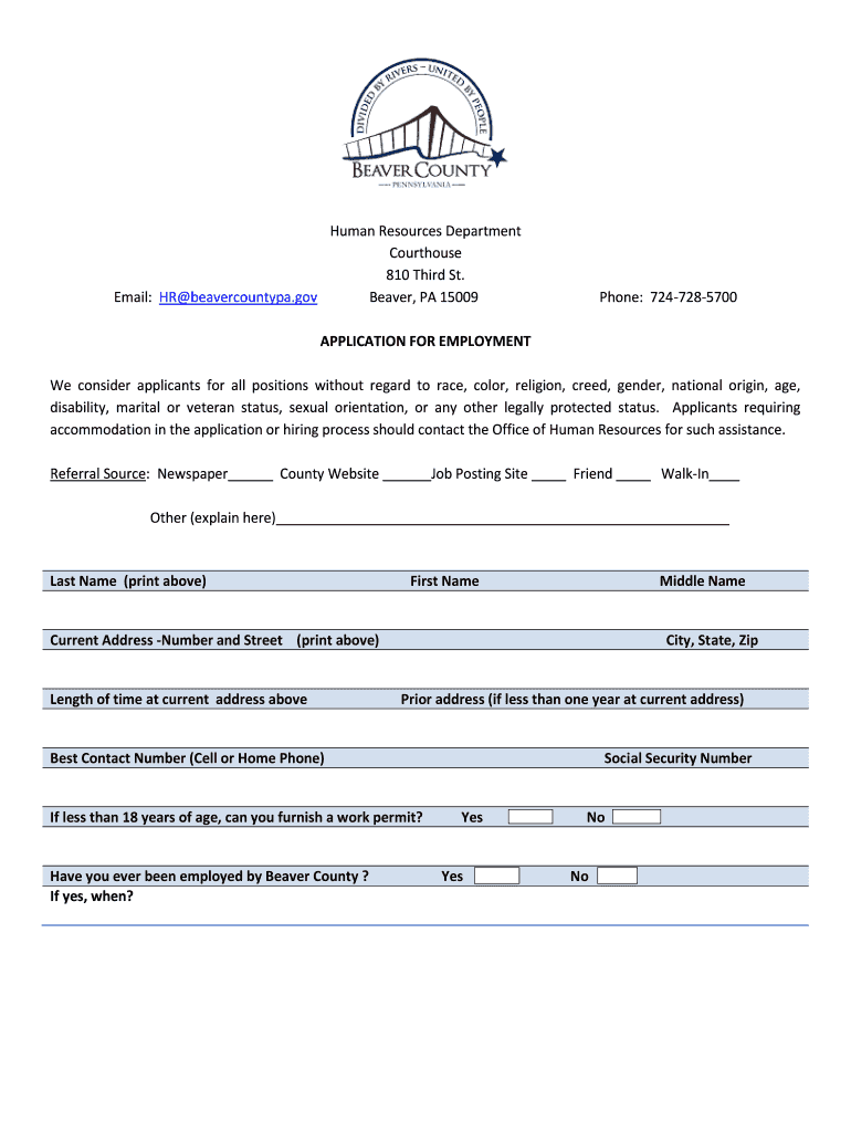 Get the free APPLICATION FOR EMPLOYMENT - Beaver County - beavercountypa