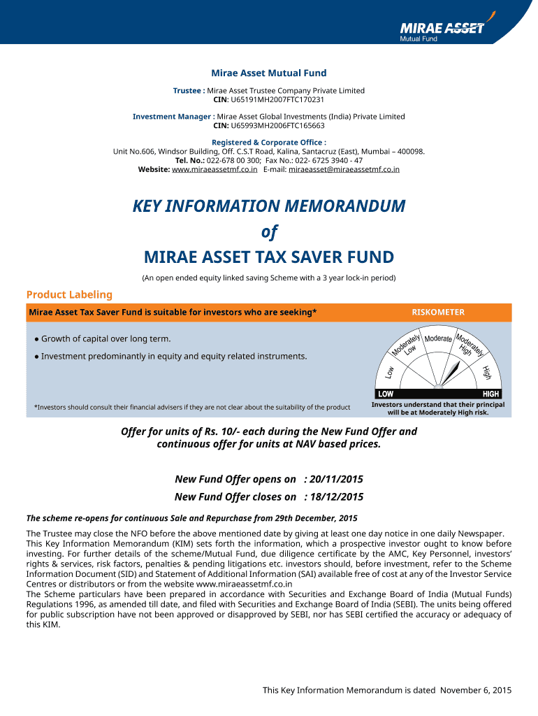 Mira Asset Mutual Fund Trustee : Mira Asset Trustee Company Private Limited IN: U65191MH2007FTC170231 Investment Manager : Mira Asset Global Investments (India) Private Limited IN: U65993MH2006FTC165663