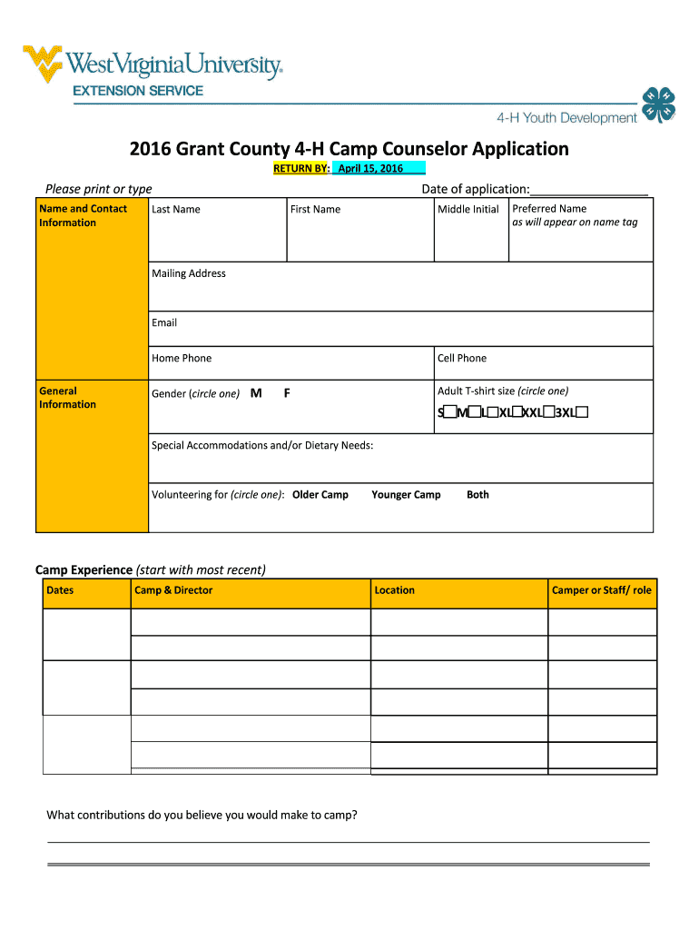 Get the free 2016 Grant County 4-H Camp Counselor Application - grant ext wvu
