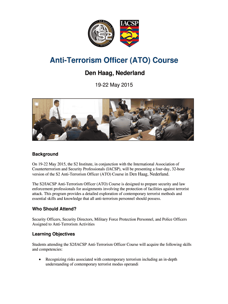 On 1821 November 2013, the S2 Institute, in conjunction with the InternationalAssociation of Counterterrorism and Security Professionals (IA CSP) will representing a four day, 32hour version of the