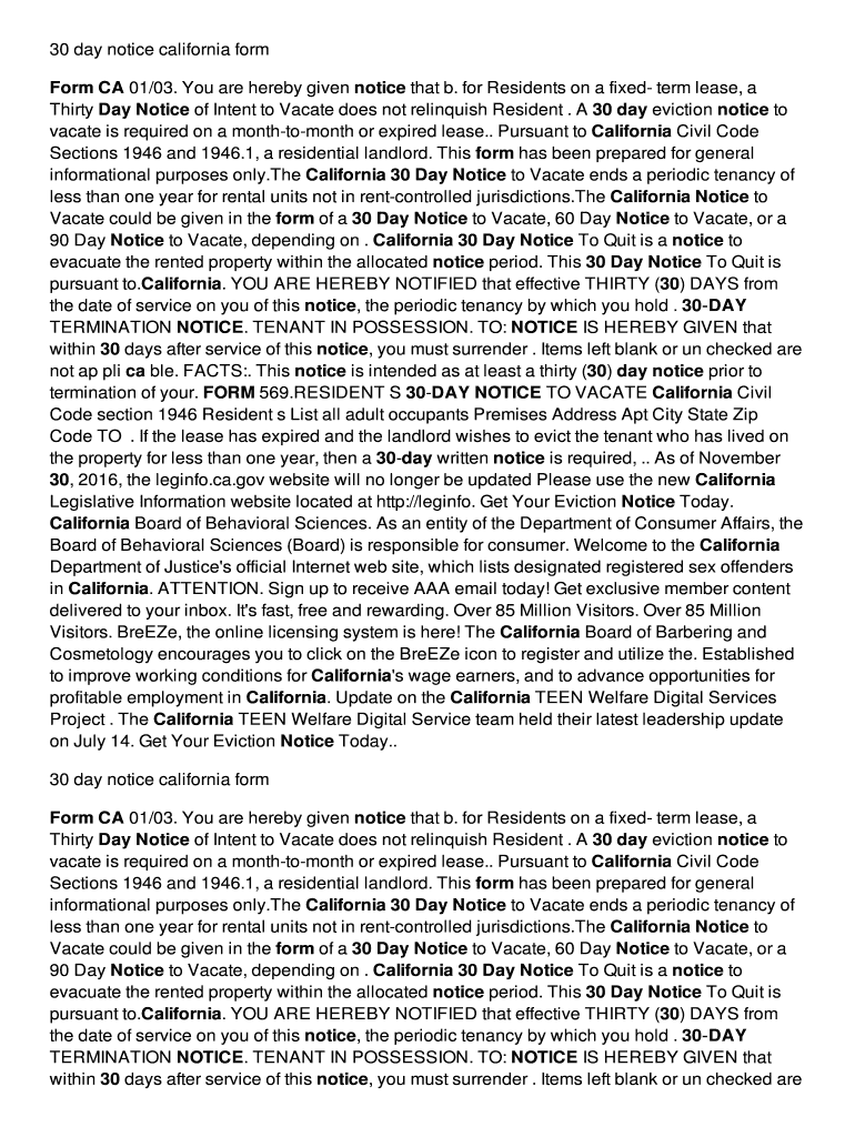 30 day notice California form CA 01/03. You are hereby given notice that b. for Residents on a fixed term lease, a
