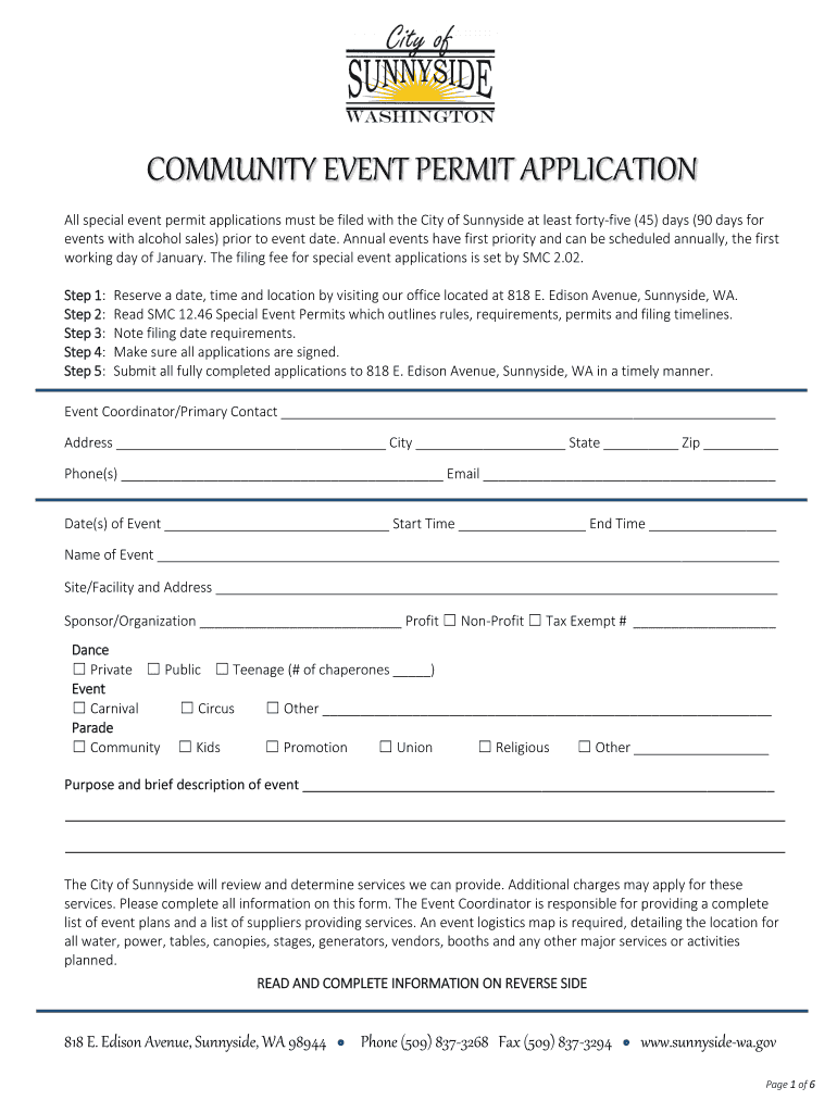Organizers planning any type of community event, such as festivals, parades, concerts, fundraisers, marathons, or fairs, typically need to fill out a community event permit application.