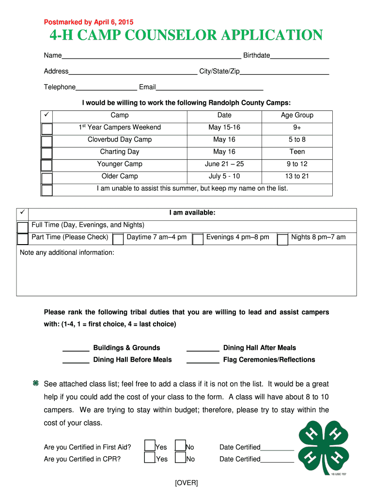 Postmarked by April 6, 2015 4-H CAMP COUNSELOR APPLICATION Name Birthdate Address City/State/Zip Telephone Email