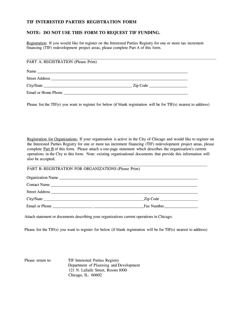 TIF INTERESTED PARTIES REGISTRATION FORM NOTE: DO NOT USE THIS FORM TO REQUEST TIF FUNDING. Registration: If you would like for register on the Interested Parties Registry for one or more tax increment