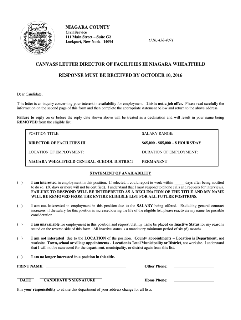 NIAGARA COUNTY Civil Service 111 Main Street Suite G2 Lock port, New York 14094 (716) 4384071 CANVASS LETTER DIRECTOR OF FACILITIES III NIAGARA HATFIELD RESPONSE MUST BE RECEIVED BY OCTOBER 10, 2016,