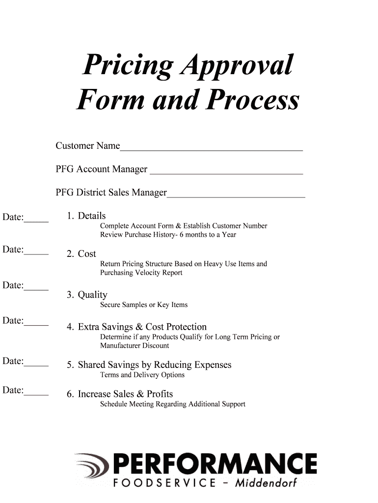 Pricing Approval Form and Process Customer Name PIG Account Manager PIG District Sales Manager Date: 1. Details Date: 2. Cost Complete Account Form & Establish Customer Number Review Purchase History