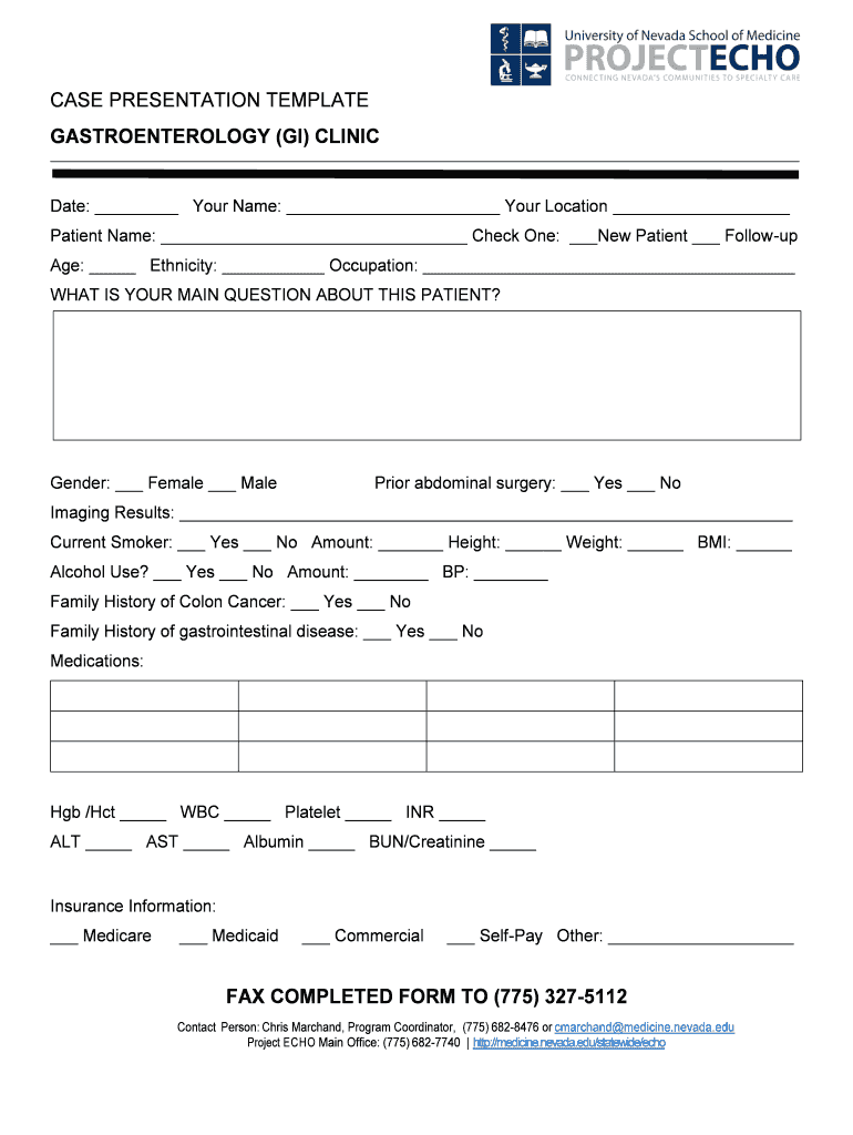 CASE PRESENTATION TEMPLATE GASTROENTEROLOGY (GI) CLINIC Date: Your Name: Your Location Patient Name: Check One: New Patient Followup Age: Ethnicity: Occupation: WHAT IS YOUR MAIN QUESTION ABOUT THIS