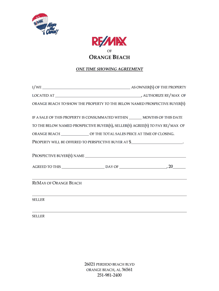 Of orange beach 26021 per dido beach blvd orange beach, all 36561 251-981-2400 one time showing agreement i/we as owner(s) of the property