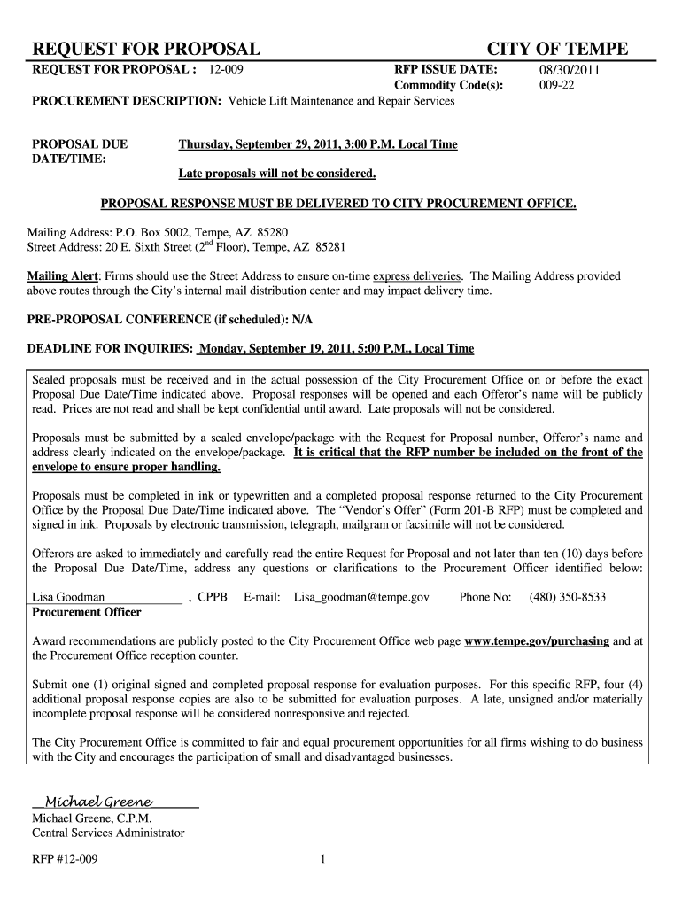 REQUEST FOR PROPOSAL CITY OF TEMPE REQUEST FOR PROPOSAL : 12009 RFP ISSUE DATE: Commodity Code(s): PROCUREMENT DESCRIPTION: Vehicle Lift Maintenance and Repair Services PROPOSAL DUE DATE/TIME: 08/30/2011