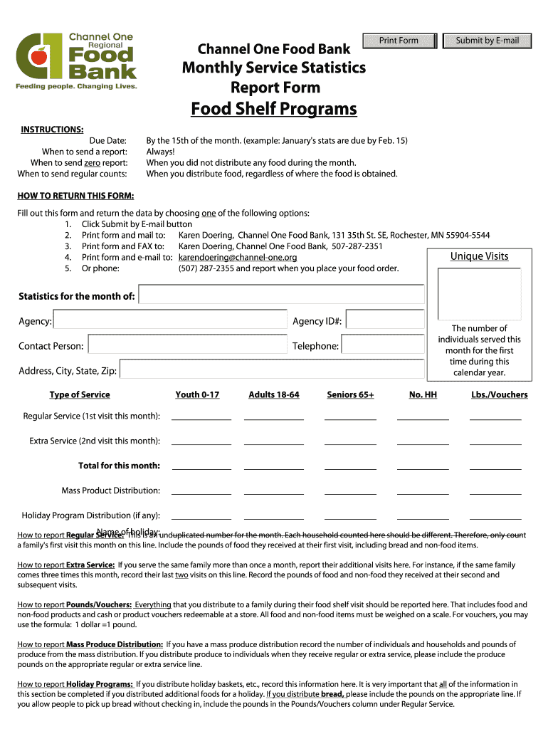 Channel One Food Bank Print Form Submit by E-mail Email Monthly Service Statistics Report Form Food Shelf Programs INSTRUCTIONS: Due Date: When to send a report: When to send zero report: When to