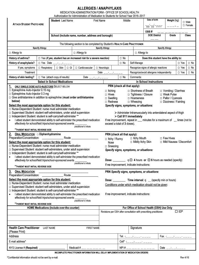 ALLERGIES / ANAPHYLAXIS MEDICATION ADMINISTRATION FORM OFFICE OF SCHOOL HEALTH Authorization for Administration of Medication to Students for School Year 20162017 Student Last Name First Name Date