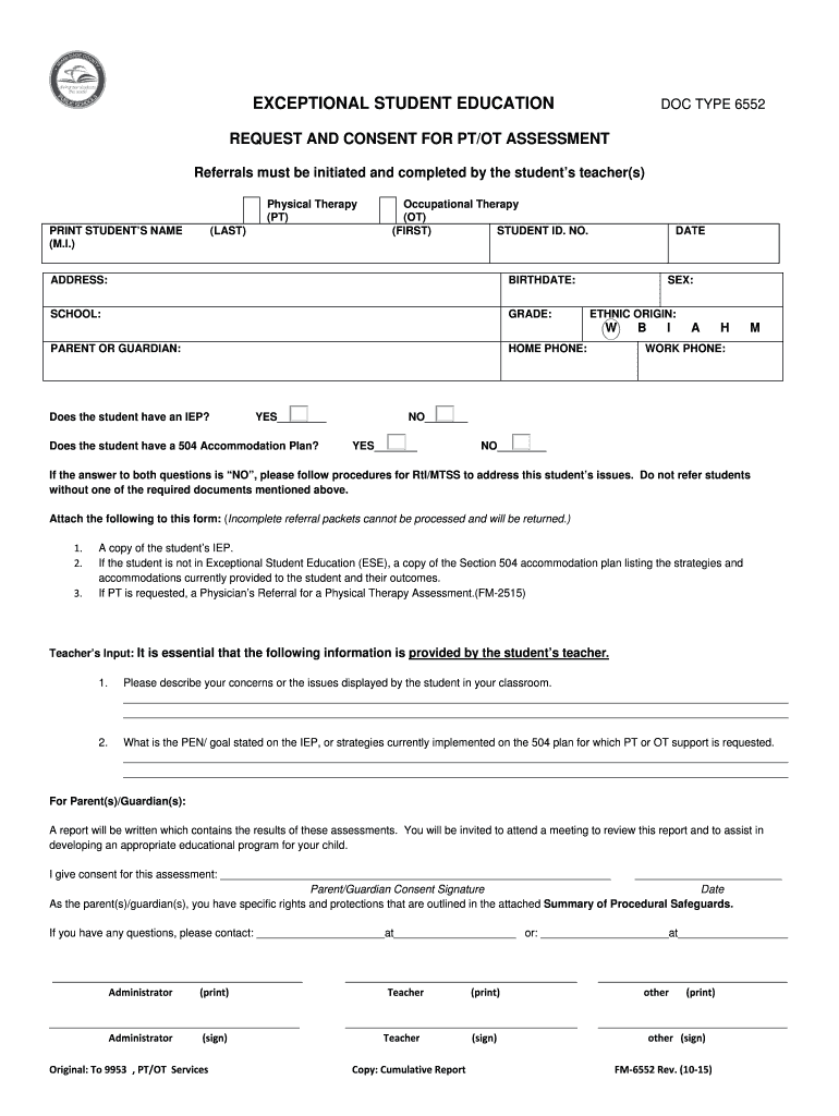 Get the free Request and Consent for PT/OT Assessment Form 6552