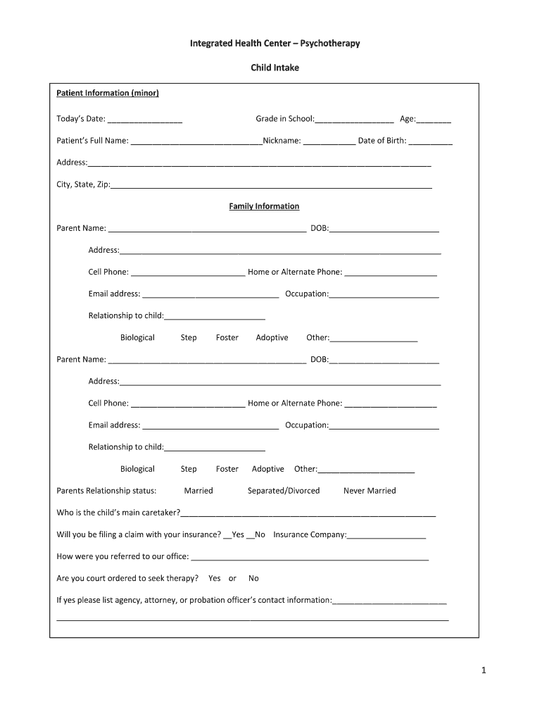 Integrated Health Center Psychotherapy Child Intake Patient Information (minor) Today's Date: Grade in School: Age: Patients Full Name: Nickname: Date of Birth: Address: City, State, Zip: Family Information